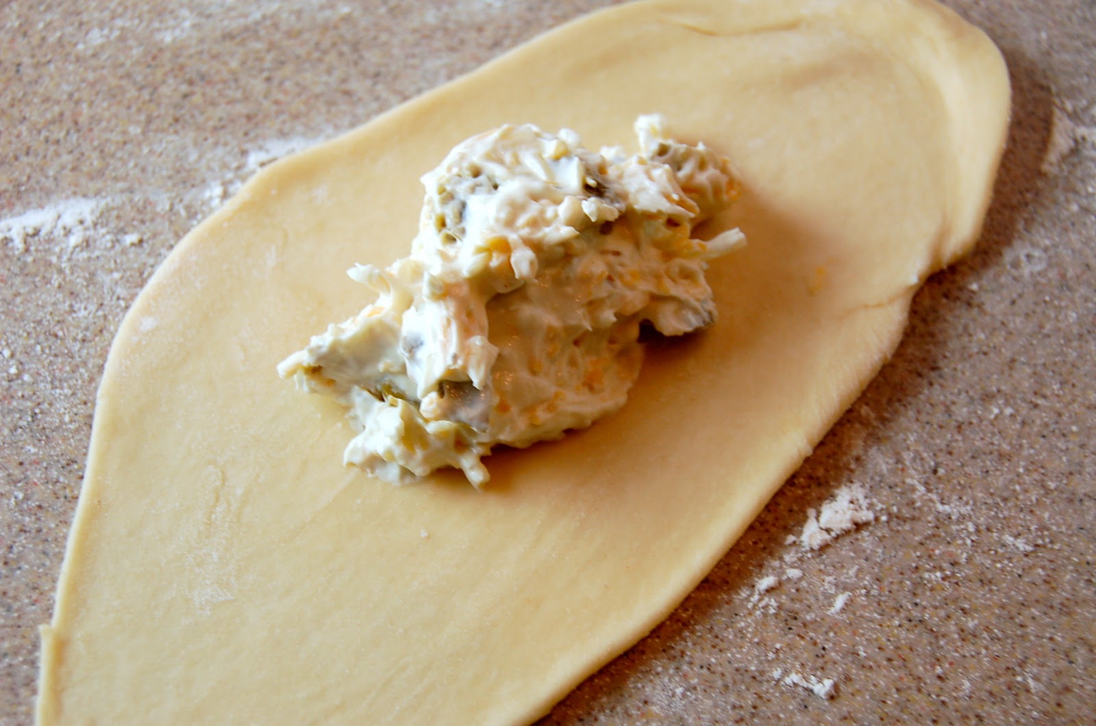 A few weeks ago, we made these pretzel sticks that were absolutely divine. They certainly were the best soft pretzels I have ever eaten in my entire life. We decided that an out-of-this-world combination would be to stuff the already delicious pretzel with jalapeno popper filling. That's precisely what I decided to bring for our "game night" the other night. Holy smokes they were tasty. All things wonderful about the soft and salty pretzel combined with the creamy, spicy, and cheesiness of the popper filling.