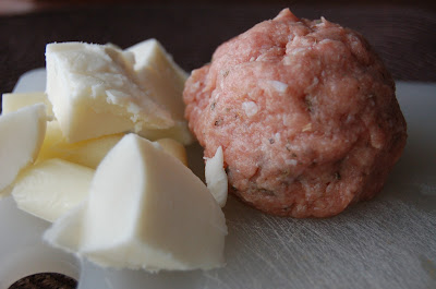 - With your hands, form into large egg-sized meatballs and shove the cheese cube into the middle. Make sure the cheese is completely covered.