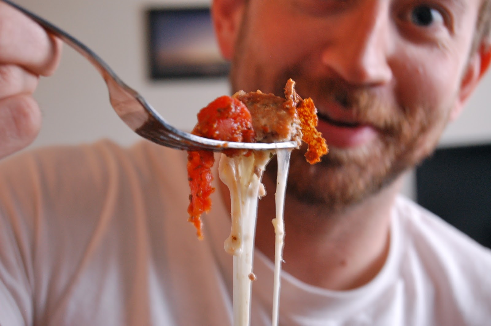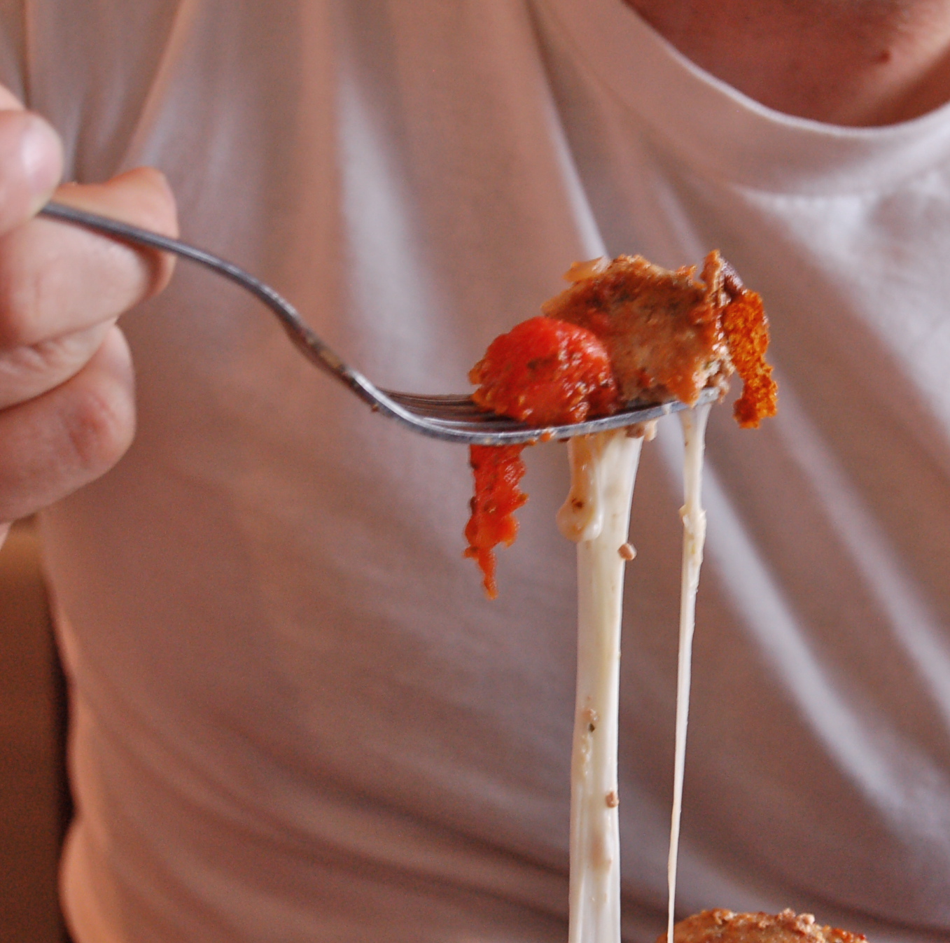Also, we did a taste test with different cheeses. For some of the meatballs, we used fresh mozzarella for the stuffing. For the other half, we used low fat Sargento string cheese cut into cubes. There were blind tasters on two different occasions and no one could tell the difference. I kid you not. So the long story short is, if you use ground turkey and low fat string cheese instead of ground beef and fresh mozzarella, you cut at least 93842093842938418034892832 calories, sodium, and fat without compromising even one iota of taste. Pretty awesome.