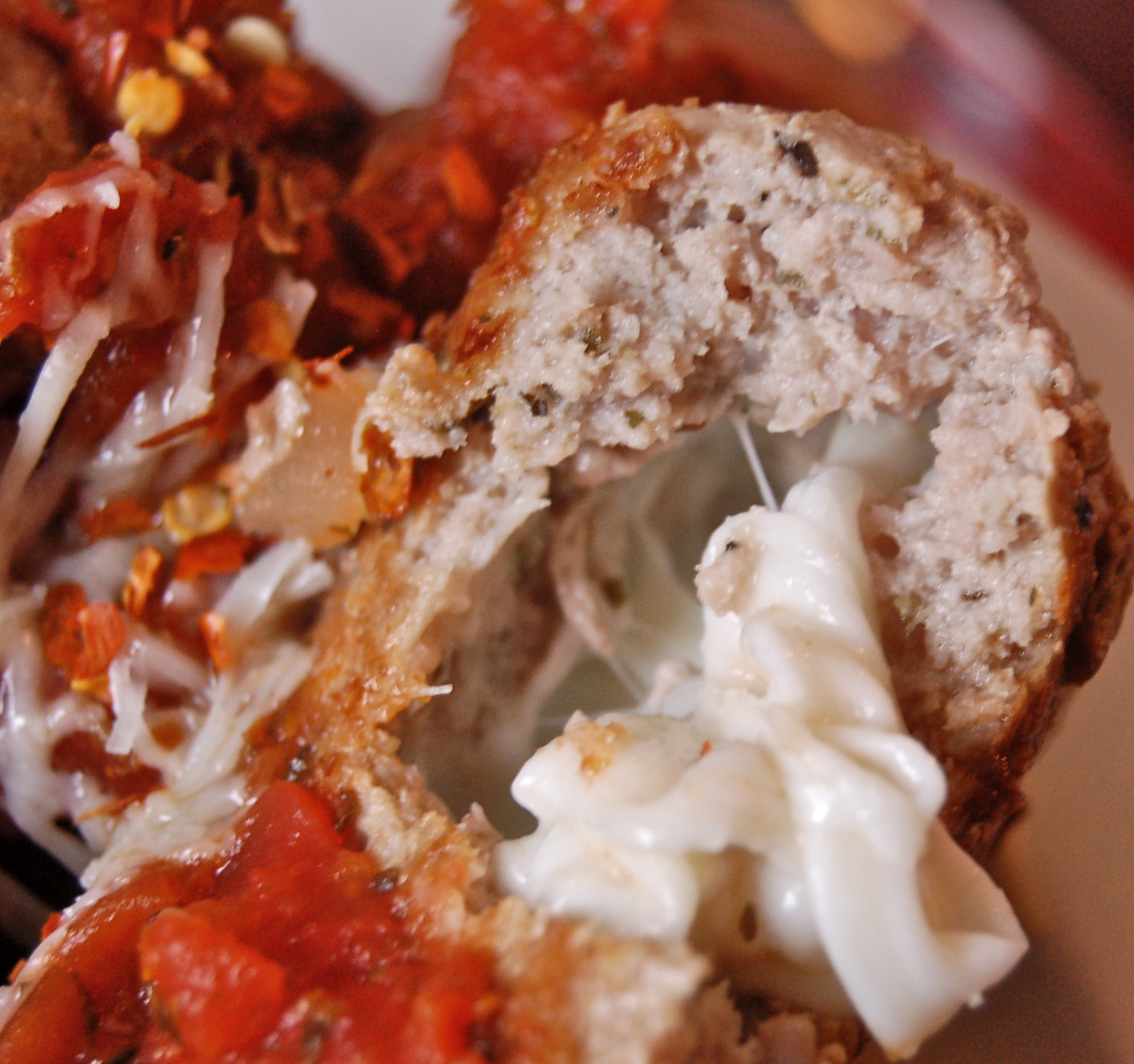 It should be no surprise that I loved this recipe. Mozzarella cheese stuffed inside a turkey meatball spiced with basil and oregano to perfection and topped with hearty tomato sauce? Yes please.