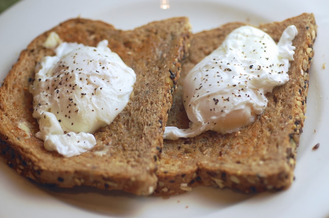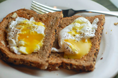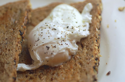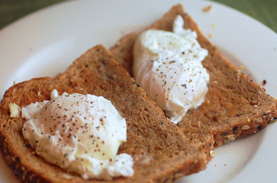 Poached eggs are great because they are so light and fresh. No bells and whistles in the form of peppers, tomatoes, mushrooms, cheese, smoked salmon, bacon, onions, salsa, sour cream, black beans, or whatever other fixing one often puts in egg dishes. For perfectly poached eggs, all you need is some multi-grain toast and some salt and pepper. That's it! The other thing I love about poached eggs is that they fuel me up for the rest of the day. High in protein, low in fat--yum. Finally, they only take 4 minutes to make!